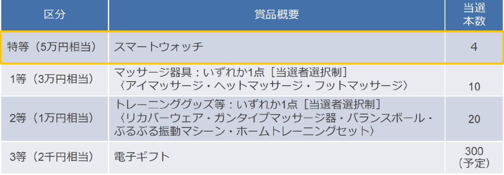 ウォーキング期間中、以下の何れもクリアした方の中から抽選で賞品をプレゼントします。